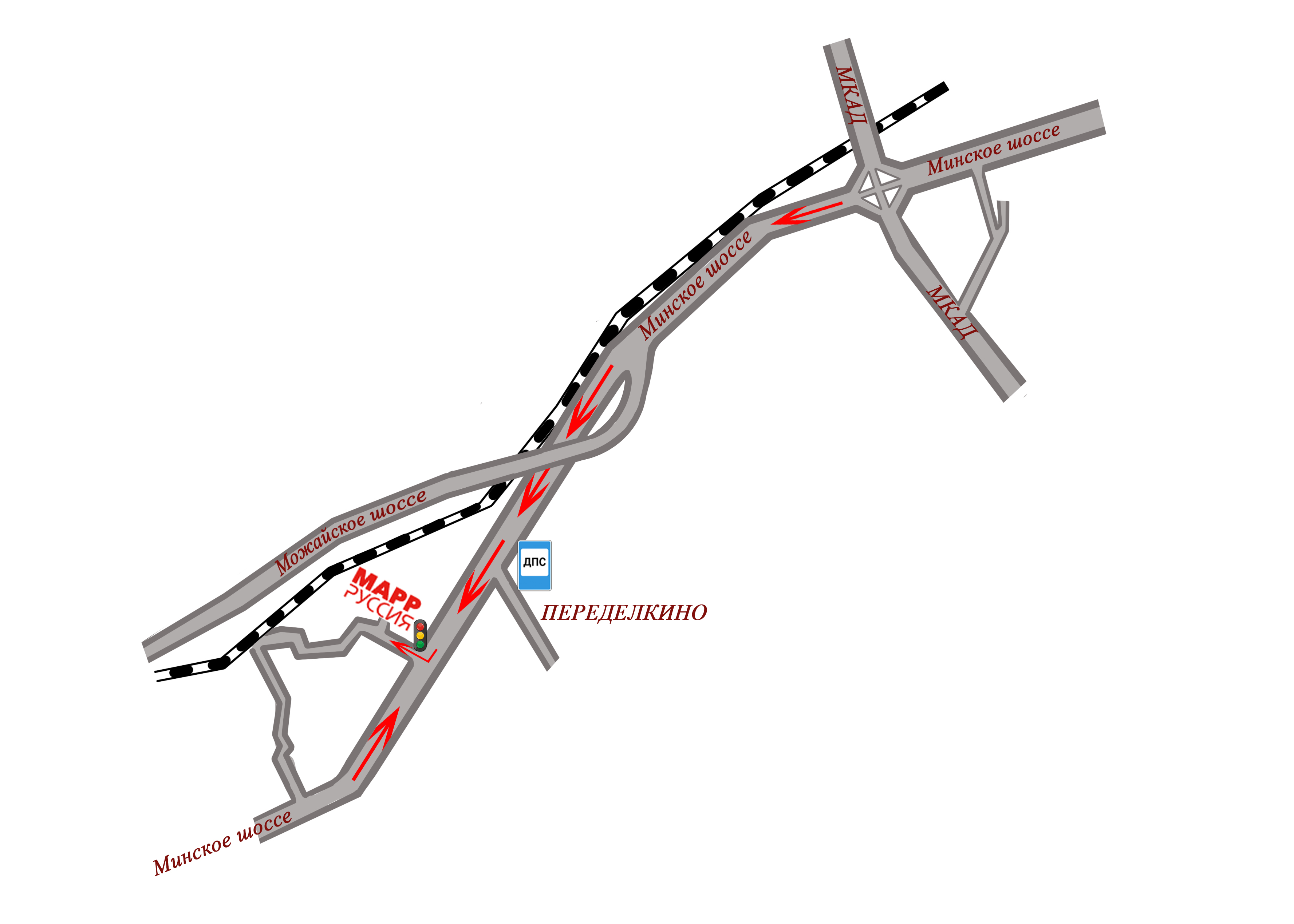 From Moscow ( 7 km from the MKAD): move along the Minsk highway towards the region, pass the fork at the entrance to Odintsovo – you need to keep to the left, then turn right at the traffic light on Vostochnaya Street, the building "MARR RUSSIA" will be on the right side.<br>